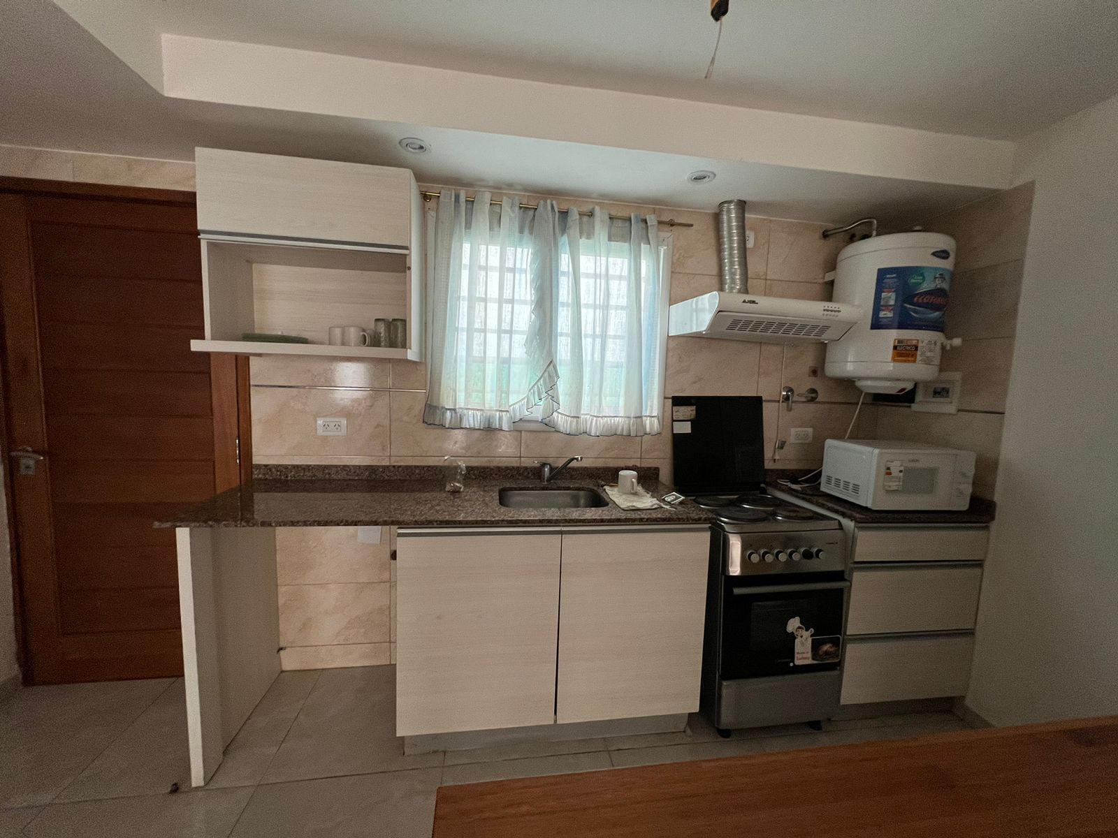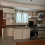 + Cocina-Comedor moderno y funcional, con bajo mesada y alacenas en melamina gris, mesada de marmol, barra desayunadora que divide el ambiente.